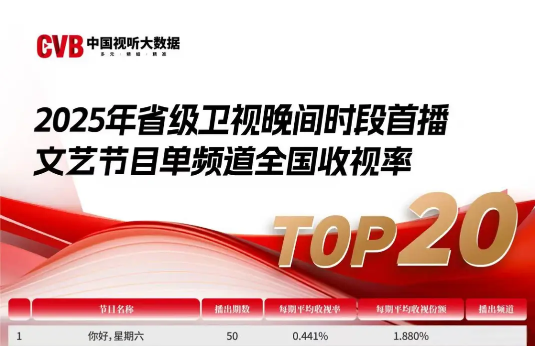 2025年已悄然步入尾声,各大平台围绕年度综艺展开的激烈角逐也终于落下帷幕。根据CVB权威收视数据统计,在2025年度省级卫视晚间时段首播的文艺节目里,芒果TV独播综艺《你好,星期六》表现卓越,一举斩获榜首之位!节目中,嘉宾们毫无拘束的“放飞式互动”,搭配节目组别出心裁、创意满满的“脑洞整活”,成功将每一个周六夜晚打造成观众翘首以盼的快乐盛宴。节目以实实在在的亮眼成绩,充分彰显了芒果棚综的强大实力与超高水准。这份荣誉的背后绝非偶然,而是节目组在内容创新上不断推陈出新、在价值传递上始终坚守初心、在观众互动上用心用情深耕细作所结出的必然硕果。所以,《你好,星期六》斩获收视第一的佳绩,当之无愧、实至名归!